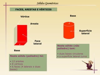 O documento apresenta diferentes tipos de sólidos geométricos, incluindo suas características e classificações. É explicado que os prismas têm duas bases iguais e quadriláteros como faces laterais, enquanto as pirâmides têm uma base e triângulos como faces laterais. Além disso, é fornecida uma planificação de modelos de sólidos como cubos, cones e cilindros.