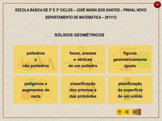 O documento discute sólidos geométricos e inclui informações sobre suas características como faces, arestas e vértices de poliedros e não poliedros, além de classificar prismas e pirâmides e planificar superfícies de sólidos.