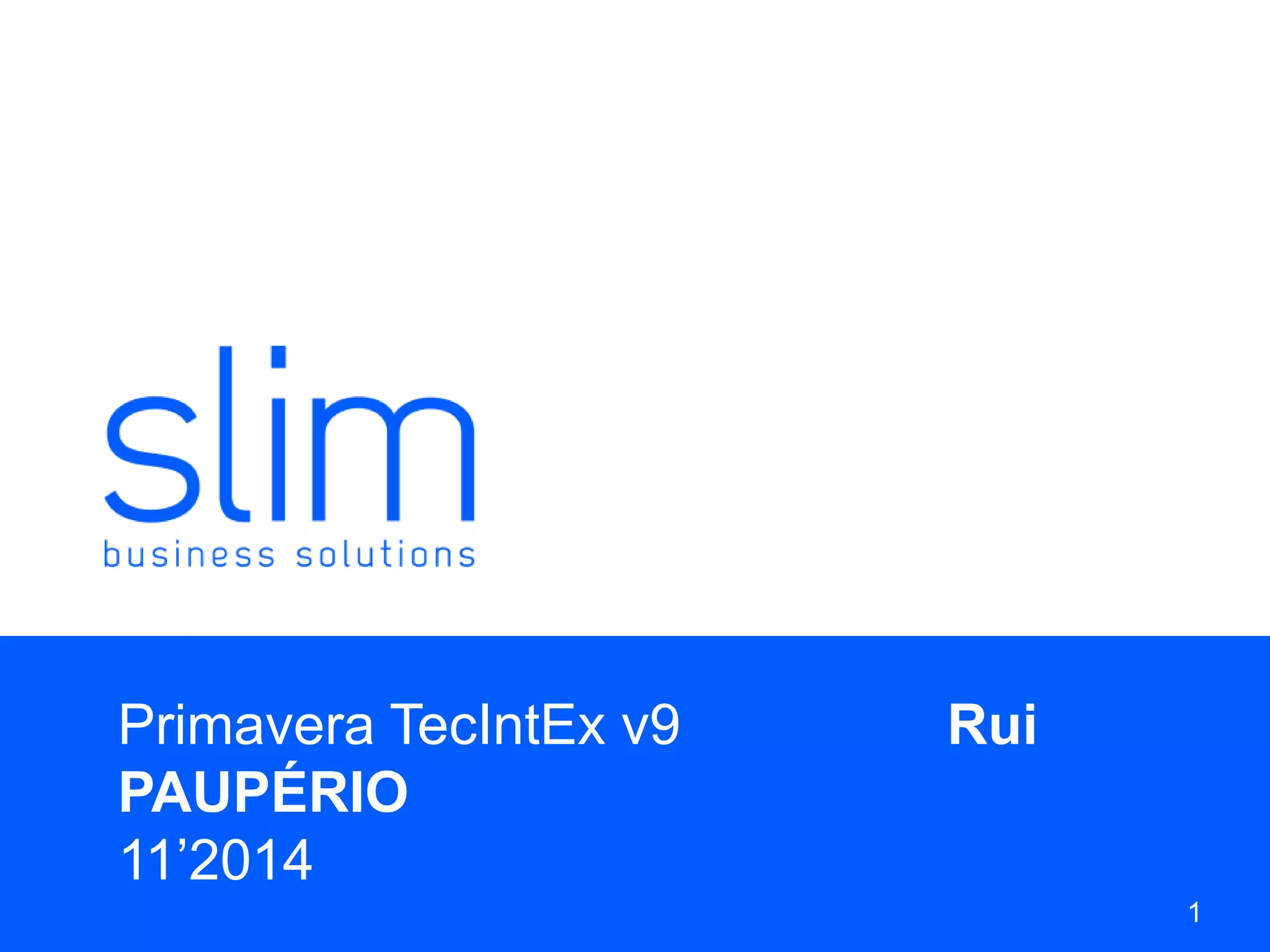 O documento descreve a SLIM Business Solutions, uma empresa portuguesa fundada em 2012 que oferece soluções de software de gestão. A empresa fornece serviços de consultoria de projetos, auditoria, suporte técnico e desenvolvimento de soluções customizadas. Ela também oferece soluções pré-construídas como gestão documental, notificações e reconciliação bancária. A empresa tem tido crescimento anual desde sua fundação.