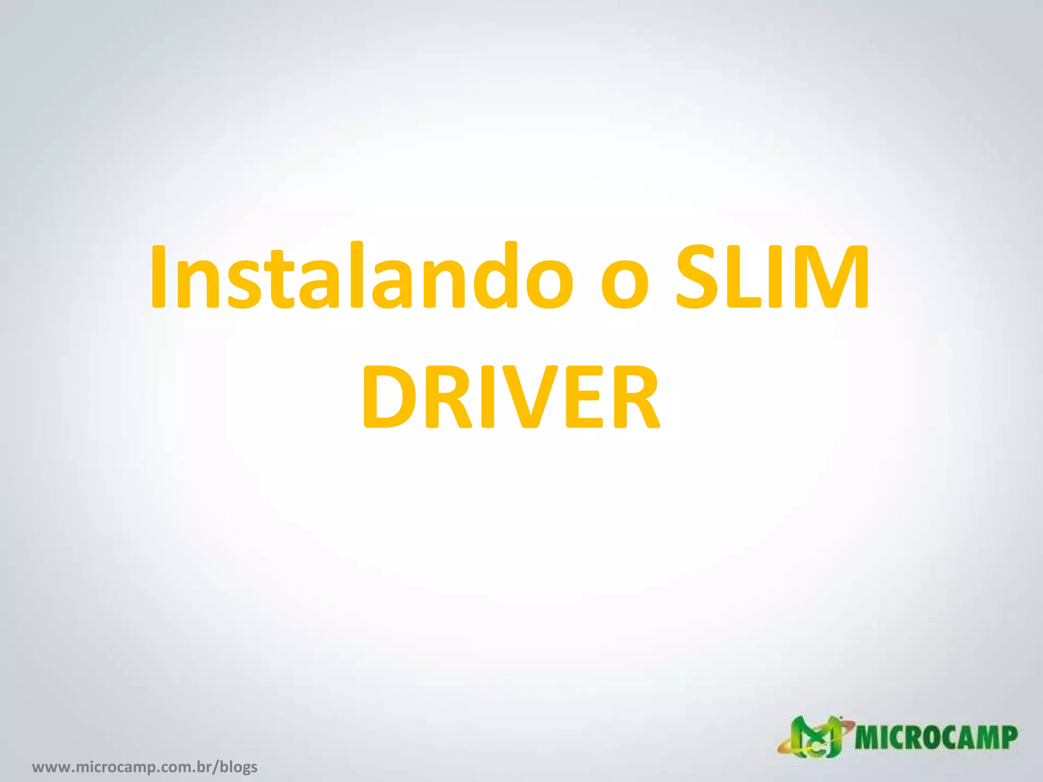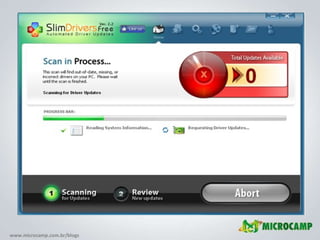 O documento descreve as etapas para instalar o driver SLIM: 1) Fazer o download e clicar no instalador; 2) Aceitar os termos e escolher a localização; 3) Clicar em "Install" para concluir a instalação; 4) O programa irá detectar quais drivers precisam ser atualizados ou instalados.