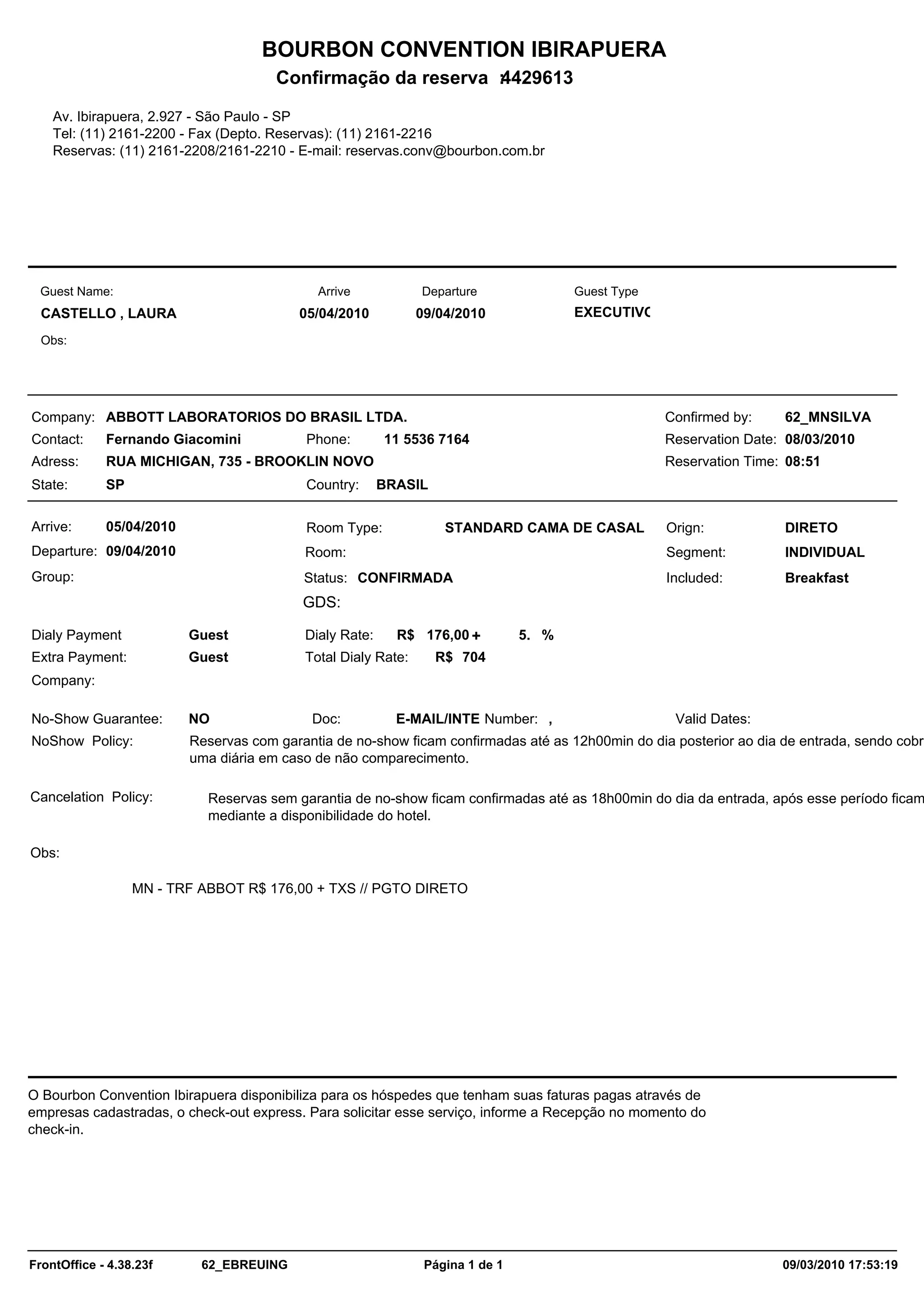 Este documento é uma confirmação de reserva no Bourbon Convention Ibirapuera para Laura Castello de 5 a 9 de abril de 2010 a trabalho para a Abbott Laboratórios do Brasil Ltda. A reserva é do tipo executivo individual com café da manhã incluído e diária de R$176,00 mais 5% de taxa.
