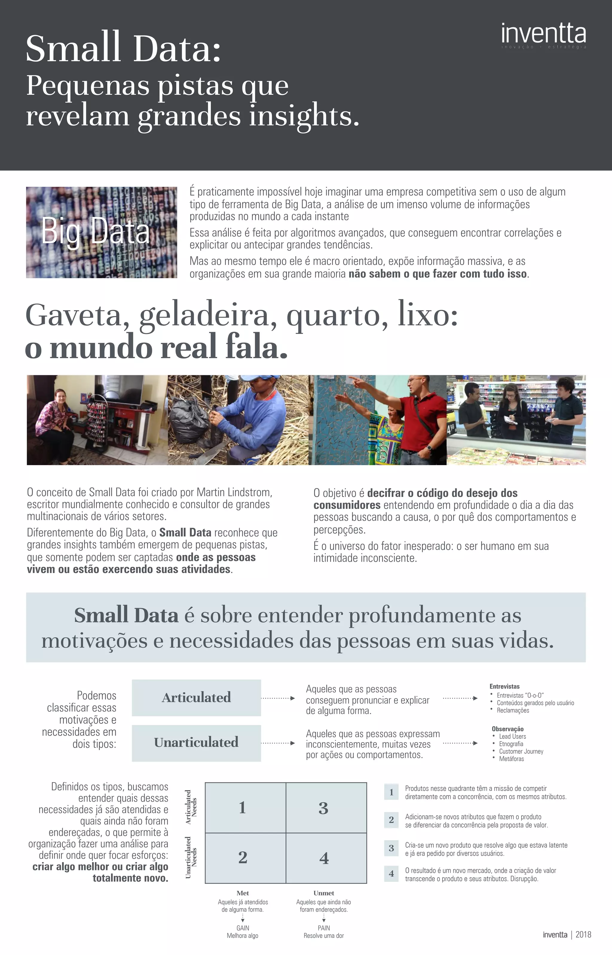 1) O documento discute o conceito de Small Data, que reconhece que insights também podem surgir de pequenas pistas captadas no dia a dia das pessoas, diferentemente do Big Data que analisa grandes volumes de dados.