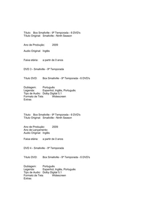 Este documento fornece informações sobre o box set de DVDs contendo as nove temporadas da série de TV Smallville. O conjunto inclui 54 DVDs com todos os episódios das nove temporadas, dublados em português. As temporadas contêm entre 20 a 22 episódios cada e fornecem detalhes sobre a juventude e o desenvolvimento dos poderes de Clark Kent/Superman.