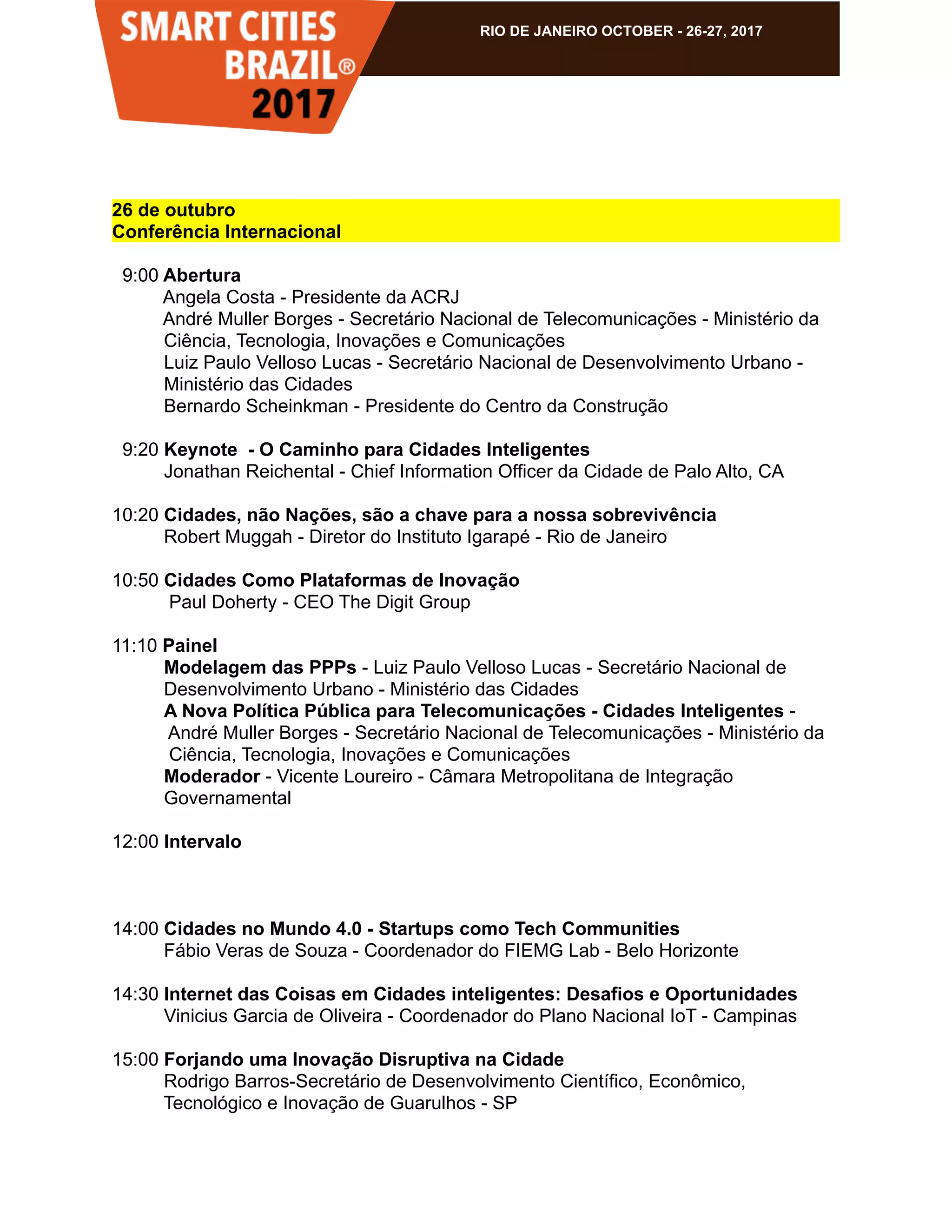 O documento descreve a programação de uma conferência internacional e um workshop sobre cidades inteligentes no Brasil em 2017. A conferência de um dia inclui palestras sobre o caminho para cidades inteligentes, cidades como plataformas de inovação e o uso de tecnologia para engajamento cívico. O workshop do dia seguinte ensina o método Lean Startup para desenvolvimento de negócios.