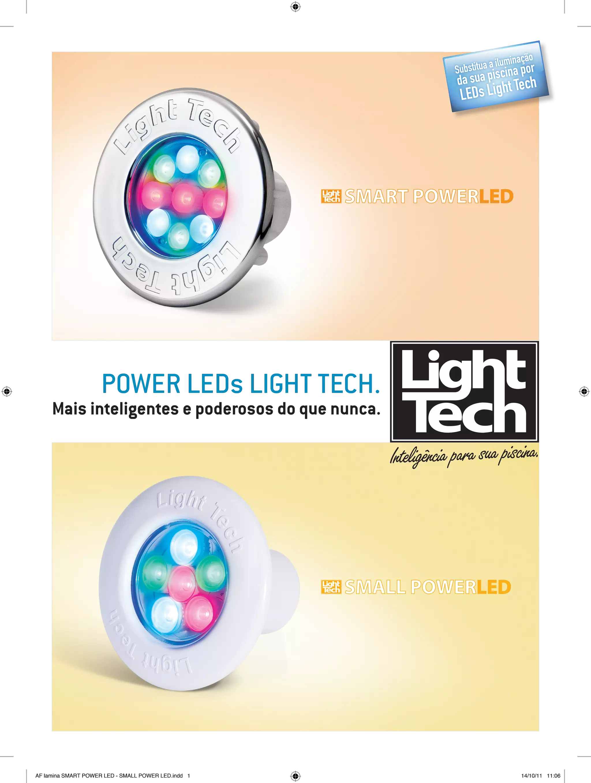 O documento descreve as lâmpadas Smart Power LED e Small Power LED, que oferecem instalação com 8 programações para iluminar áreas como piscinas e decks. Ambos os modelos possuem um controlador externo e são projetados para substituir holofotes e refletores convencionais, com diferentes especificações técnicas de instalação e consumo. A instalação requer cabos apropriados e atender a certas condições de operação, como temperatura máxima e tensão de alimentação.