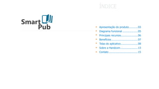O Smart Pub é uma plataforma que centraliza periódicos científicos, permitindo acesso fácil e prático a conteúdos por meio de um aplicativo. Ele oferece recursos como gerenciamento de edições, acesso a favoritos, e ferramentas de compartilhamento, visando a disseminação eficiente do conhecimento. A Handcom, responsável pelo Smart Pub, possui 12 anos de experiência e busca excelência em gestão por meio de parcerias e certificações.