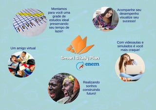 O documento propõe uma grade de estudos para aumentar o rendimento acadêmico preservando o lazer, oferecendo videoaulas e simulados para acompanhar o desempenho e alcançar o sucesso, visando construir o futuro e realizar sonhos.