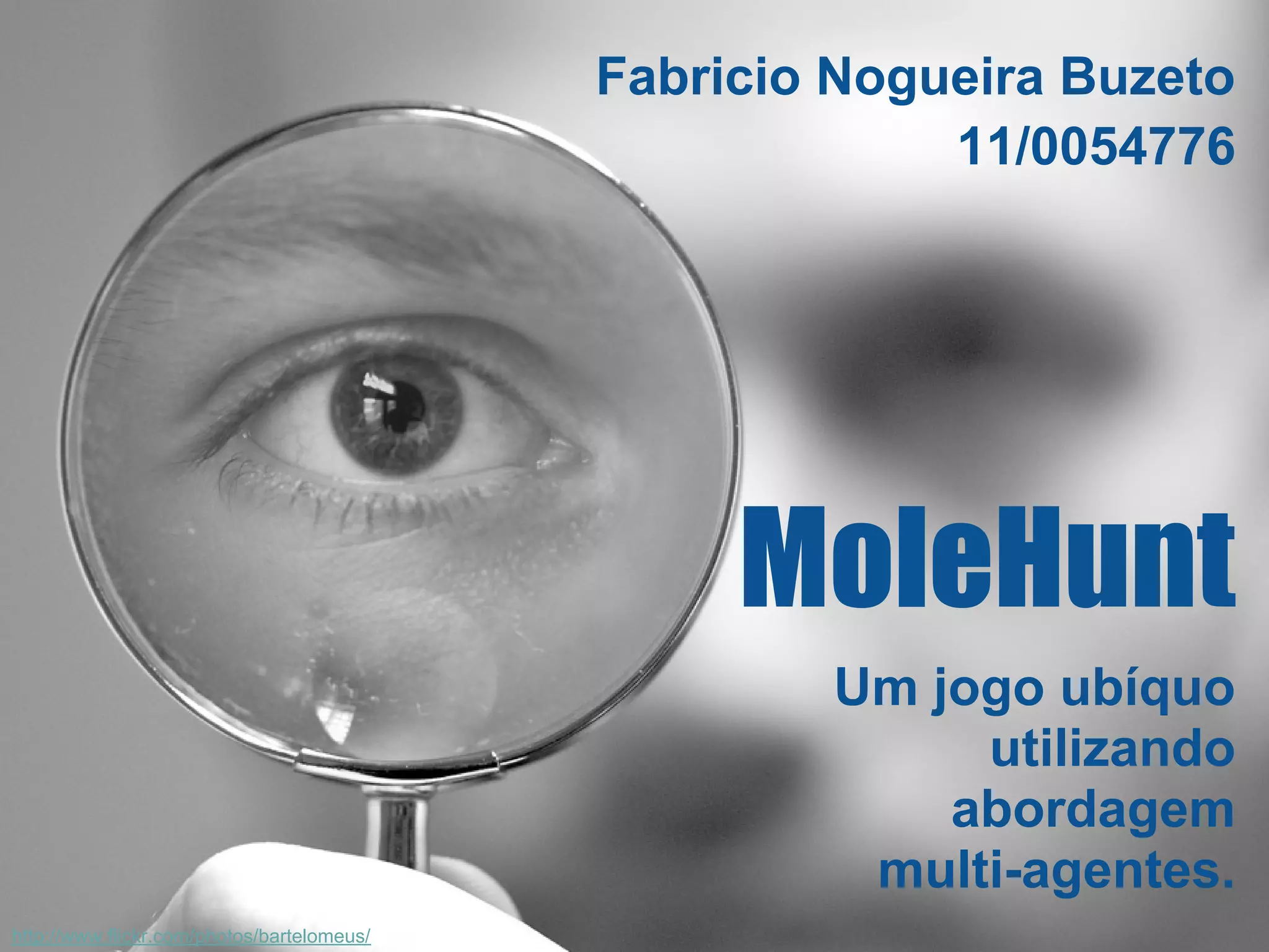 O documento descreve um jogo chamado MoleHunt que utiliza abordagem multi-agentes para computação ubíqua. O jogo envolve agentes Capture e Control que interagem para permitir que jogadores encontrem letras escondidas no ambiente. O jogo é configurável e pode ser jogado em diferentes ambientes com agentes que percebem e agem de forma dinâmica.