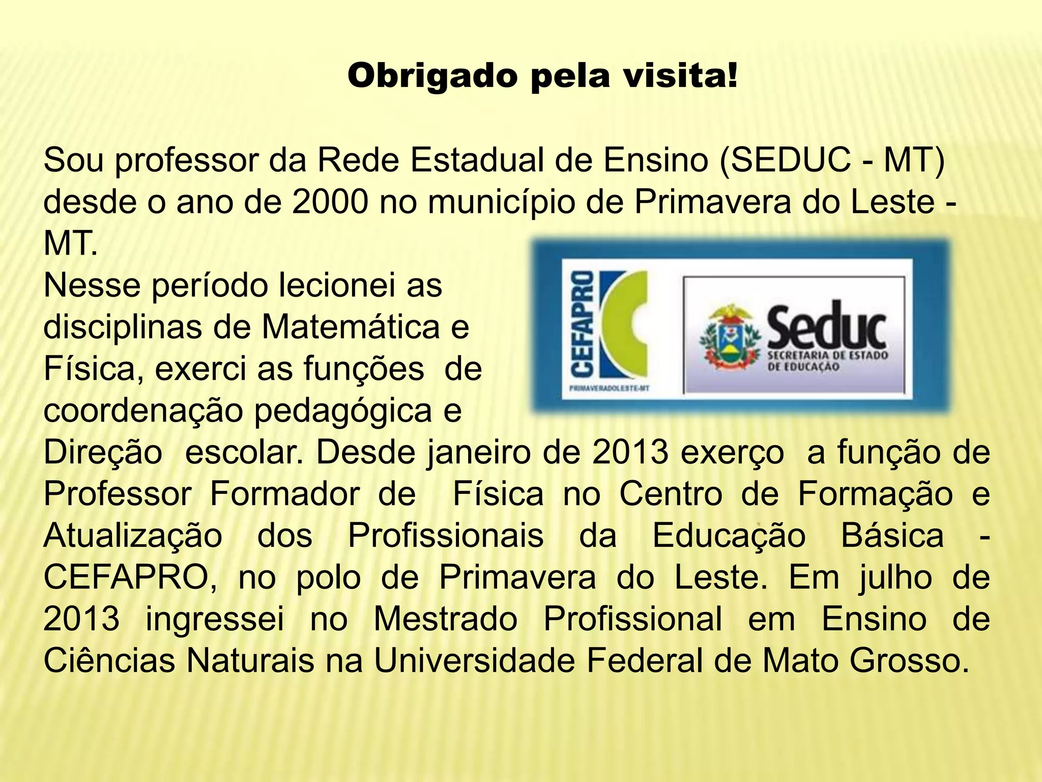 O documento apresenta o currículo de um professor da rede estadual de ensino de Mato Grosso que leciona matemática e física desde 2000, exerceu funções de coordenação pedagógica e direção escolar, atualmente é professor formador de física no CEFAPRO e está cursando mestrado em ensino de ciências na UFMT.