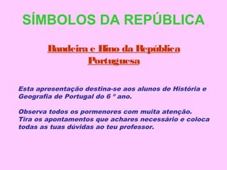 Este documento fornece informações sobre os símbolos da República Portuguesa, incluindo a história da bandeira e do hino nacional. Detalha o processo de escolha da bandeira após a implantação da República em 1910, incluindo as primeiras propostas e a bandeira finalmente adotada. Também descreve as características e regras de uso da atual bandeira portuguesa, bem como a história e letra completa do hino nacional "A Portuguesa".