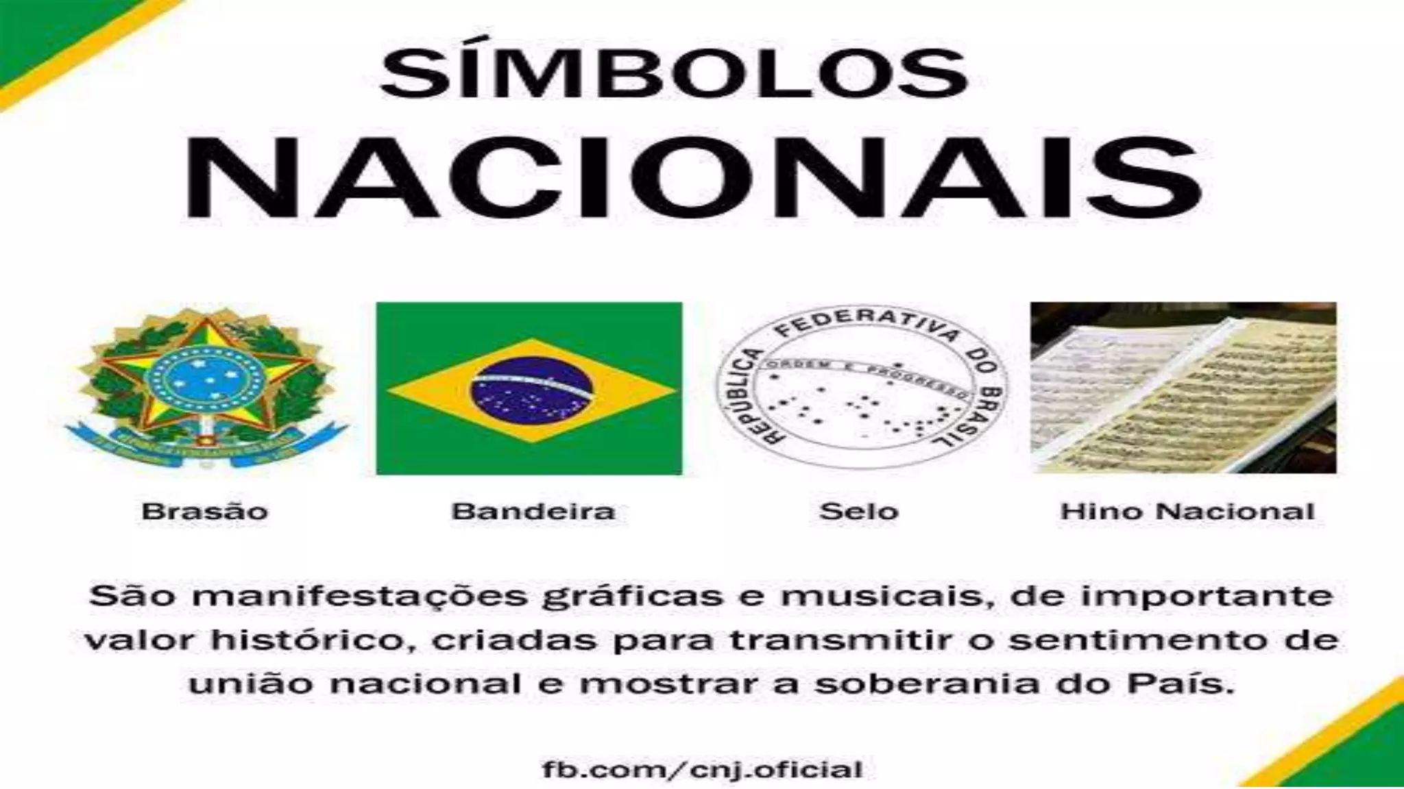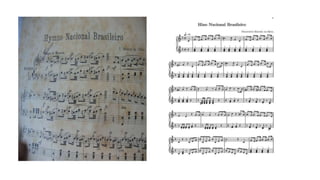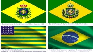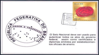 O documento descreve os principais símbolos nacionais brasileiros, incluindo a bandeira nacional, as armas nacionais, o selo nacional e o hino nacional. A bandeira nacional foi instituída em 1889 e incorporou a frase "Ordem e Progresso", enquanto as armas nacionais representam a glória do Brasil. O selo nacional é usado para autenticar documentos oficiais e o hino nacional tornou-se oficial em 1971.