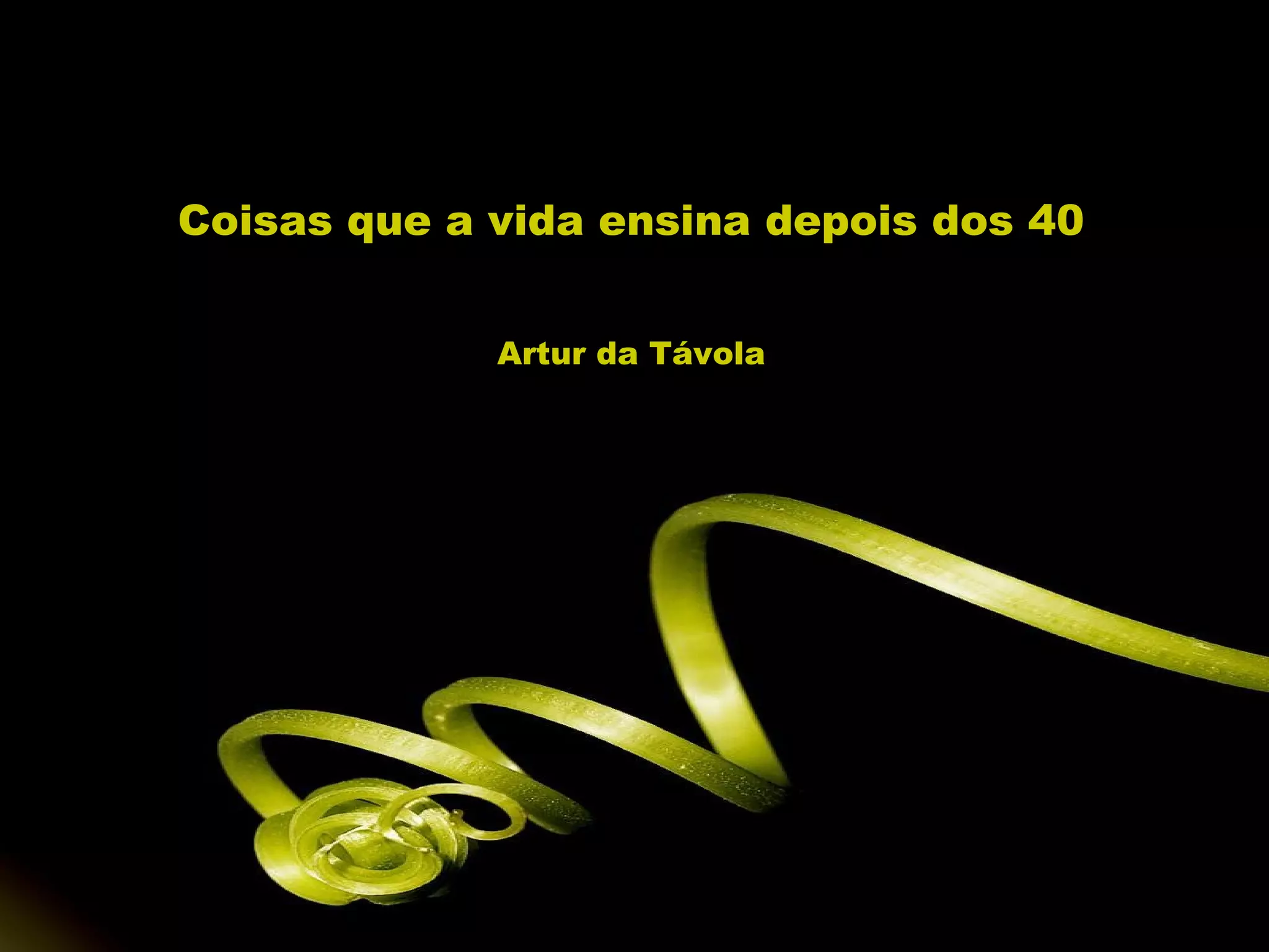 Este documento apresenta várias lições de vida que podem ser aprendidas após os 40 anos. Algumas dessas lições incluem: não implorar por amor, perdoar e esquecer para se manter jovem, crianças aprendem mais com ações do que palavras, e o amor quebra barreiras e une pessoas.