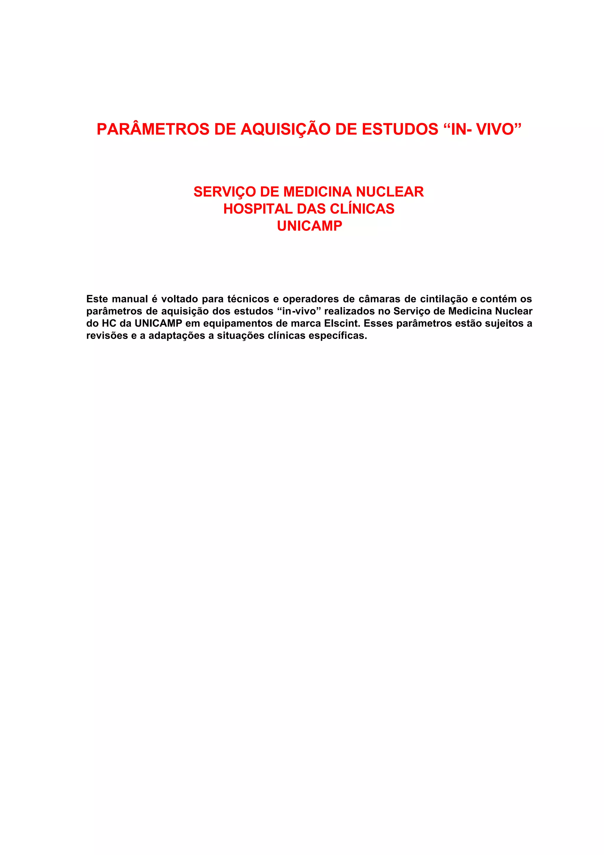 Este documento contém parâmetros de aquisição para estudos "in vivo" realizados no Serviço de Medicina Nuclear do HC da UNICAMP, incluindo ventriculografia, perfusão miocárdica, pesquisa de viabilidade e necrose miocárdica. Fornece instruções detalhadas sobre preparo do paciente, dose de radiofármaco, posicionamento e parâmetros de aquisição para cada estudo.