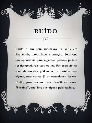 O documento discute os perigos do ruído excessivo, incluindo perda auditiva temporária e permanente, estresse no sistema circulatório, respiratório e digestivo, dores de cabeça, cansaço e elevação da pressão arterial. O uso contínuo de alto volume em aparelhos como MP3 também pode levar à perda de audição.