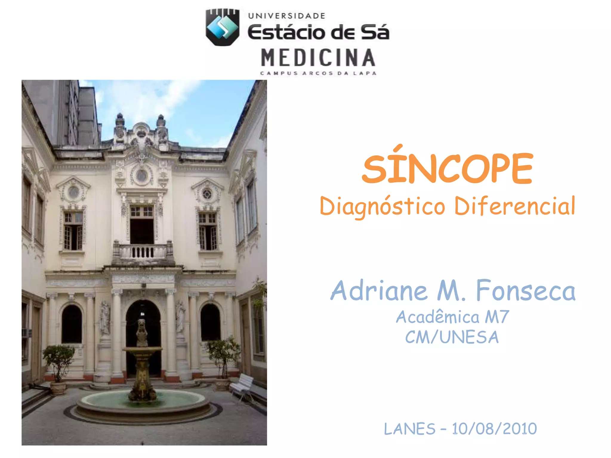 O documento discute a importância do diagnóstico diferencial da síncope, listando suas principais causas e abordagens diagnósticas. É destacada a necessidade de avaliação inicial para identificar a causa e orientar o tratamento específico, reduzindo os casos inexplicados de 14-18% com novos testes como monitoramento de eventos implantável.