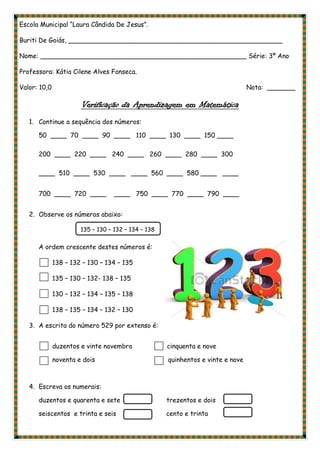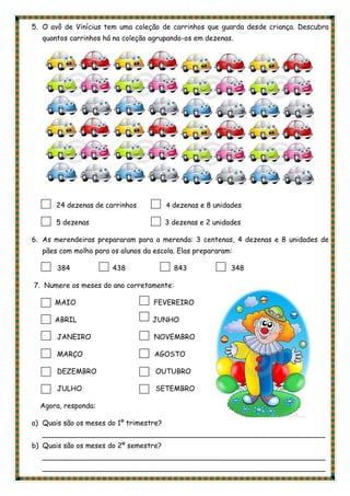 A prova de matemática continha questões sobre sequências numéricas, ordem crescente de números, escrita de números por extenso, numerais, agrupamento de objetos em dezenas, leitura de horas, resolução de problemas e meses do ano. As questões testavam conceitos como sequências aritméticas, comparação e ordenação de números, conversão entre escrita e numeral, agrupamento em unidades e dezenas, leitura analógica de horas e resolução de problemas matemáticos.