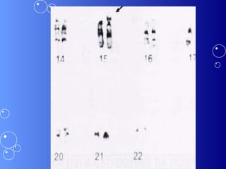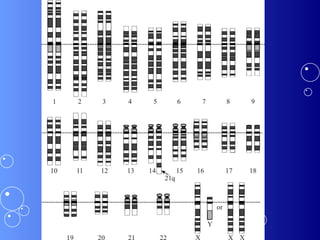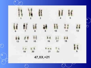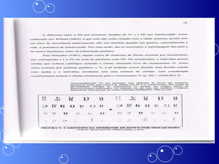 A síndrome de Down é uma anomalia genética causada pela presença de um cromossomo 21 extra. Isso resulta em atraso no desenvolvimento motor e mental da criança. Características comuns incluem face achatada, olhos oblíquos, orelhas pequenas e problemas de saúde como cardiopatias e problemas auditivos. O diagnóstico é feito através de exames pré-natais ou cromossômicos após o nascimento. O tratamento envolve uma equipe multidisciplinar e fisioterapia foc