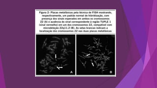 A síndrome de DiGeorge é causada por uma deleção no cromossomo 22 e causa hipoplasia do timo, defeitos cardíacos congênitos e hipocalcemia. Ela apresenta características variáveis e mais de 180 achados clínicos em diferentes sistemas. O diagnóstico é feito por estudos citogenéticos e o acompanhamento requer monitoramento do sistema imunológico, cardiovascular e dos níveis de cálcio.