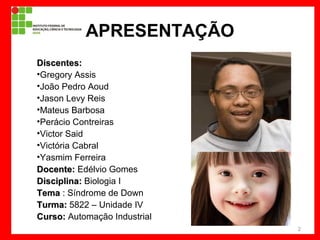 Este documento apresenta informações sobre a Síndrome de Down, incluindo suas causas genéticas, características físicas e comportamentais, diagnóstico, acompanhamento e esforços de inclusão social. A síndrome é causada por uma trissomia no par 21 e afeta aproximadamente 1 em cada 800 nascimentos.