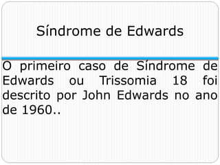 A Síndrome de Edwards é uma trissomia rara caracterizada por microcefalia, má formação congênita do abdômen, atraso de crescimento e outras anomalias físicas. Foi descrita pela primeira vez em 1960 e afeta de 1 em cada 3.500 a 7.000 nascidos vivos, predominantemente do sexo feminino. A maioria dos fetos não sobrevive ao nascer e a probabilidade de sobrevivência além da adolescência é baixa.