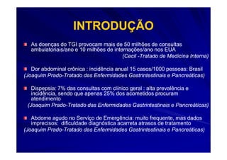 O documento discute as principais síndromes abdominais, incluindo a doença do refluxo gastroesofágico, síndromes dispépticas e úlcera péptica. Ele descreve os sintomas, fisiopatologia, diagnóstico e tratamento destas condições.