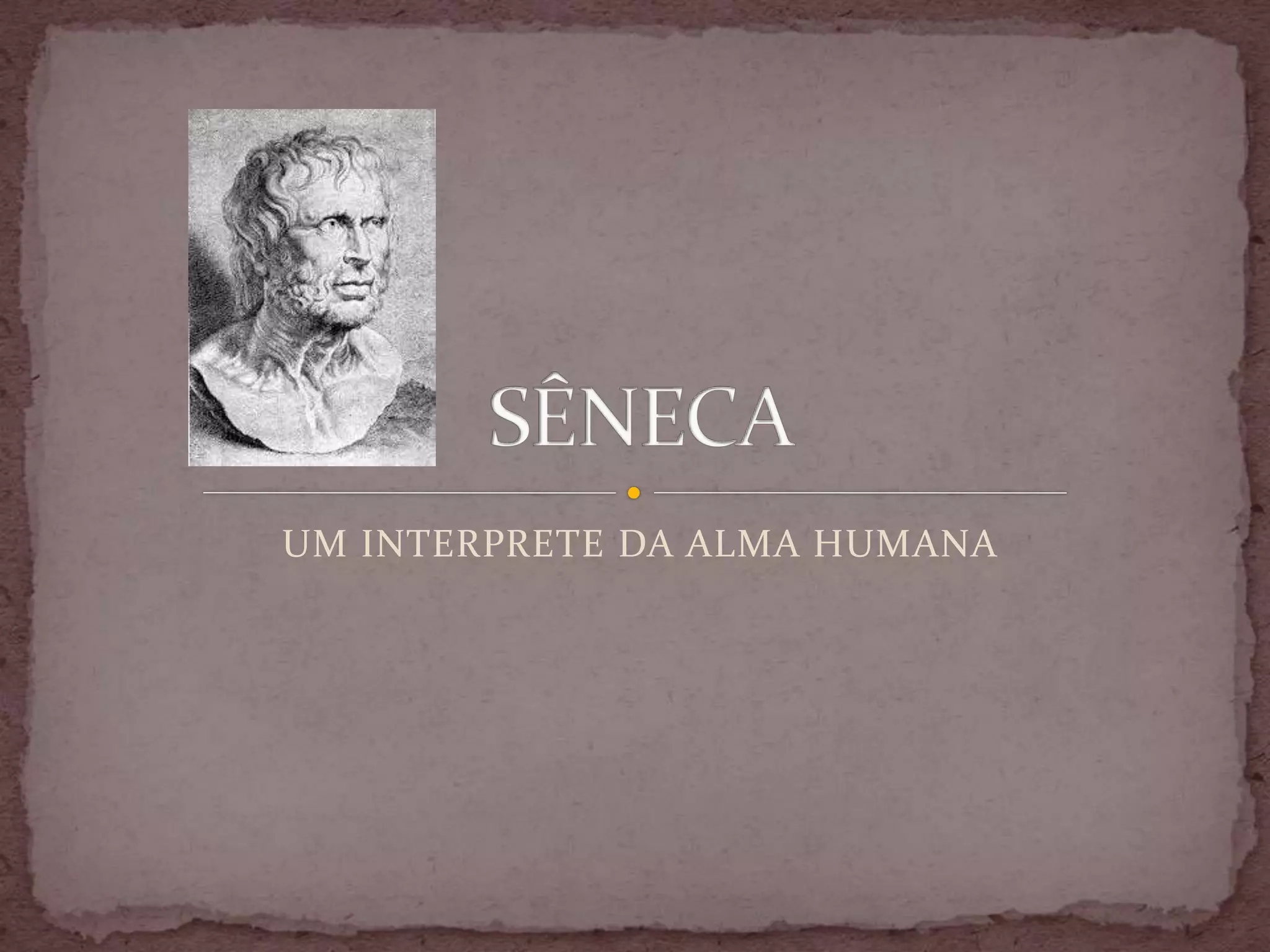 Sêneca foi um filósofo e político romano do período helenístico que desenvolveu uma abordagem prática da filosofia estoica. Ele considerava a filosofia como um assunto eminentemente prático para ensinar a viver bem, indo além do materialismo estoico ao descobrir a consciência e vontade como faculdades distintas. Sua filosofia moral enfatizava a igualdade entre os homens e se opunha à escravidão, buscando consolar aqueles que sofrem diante da d