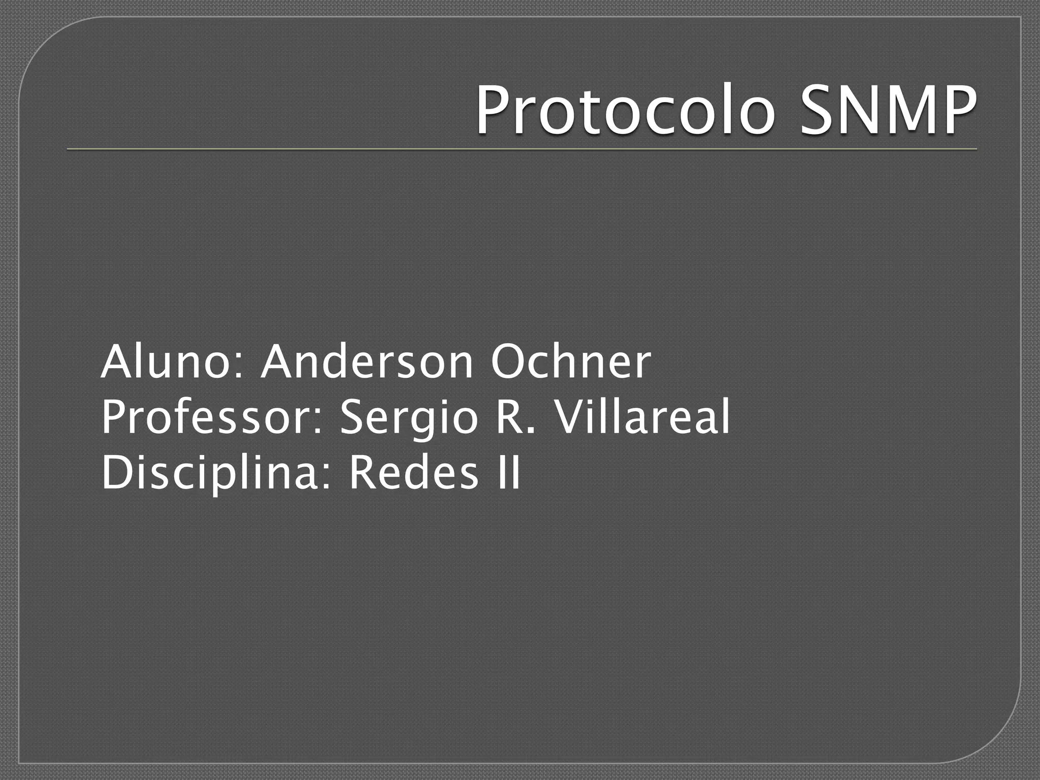 O documento descreve o protocolo SNMP, que é usado para gerenciar dispositivos de rede. O SNMP permite que um gerente obtenha informações como temperatura e velocidade de conexão de dispositivos, e envie comandos a eles. O protocolo divide as responsabilidades entre agentes, que enviam dados nos dispositivos, e o gerente, que solicita e recebe informações.
