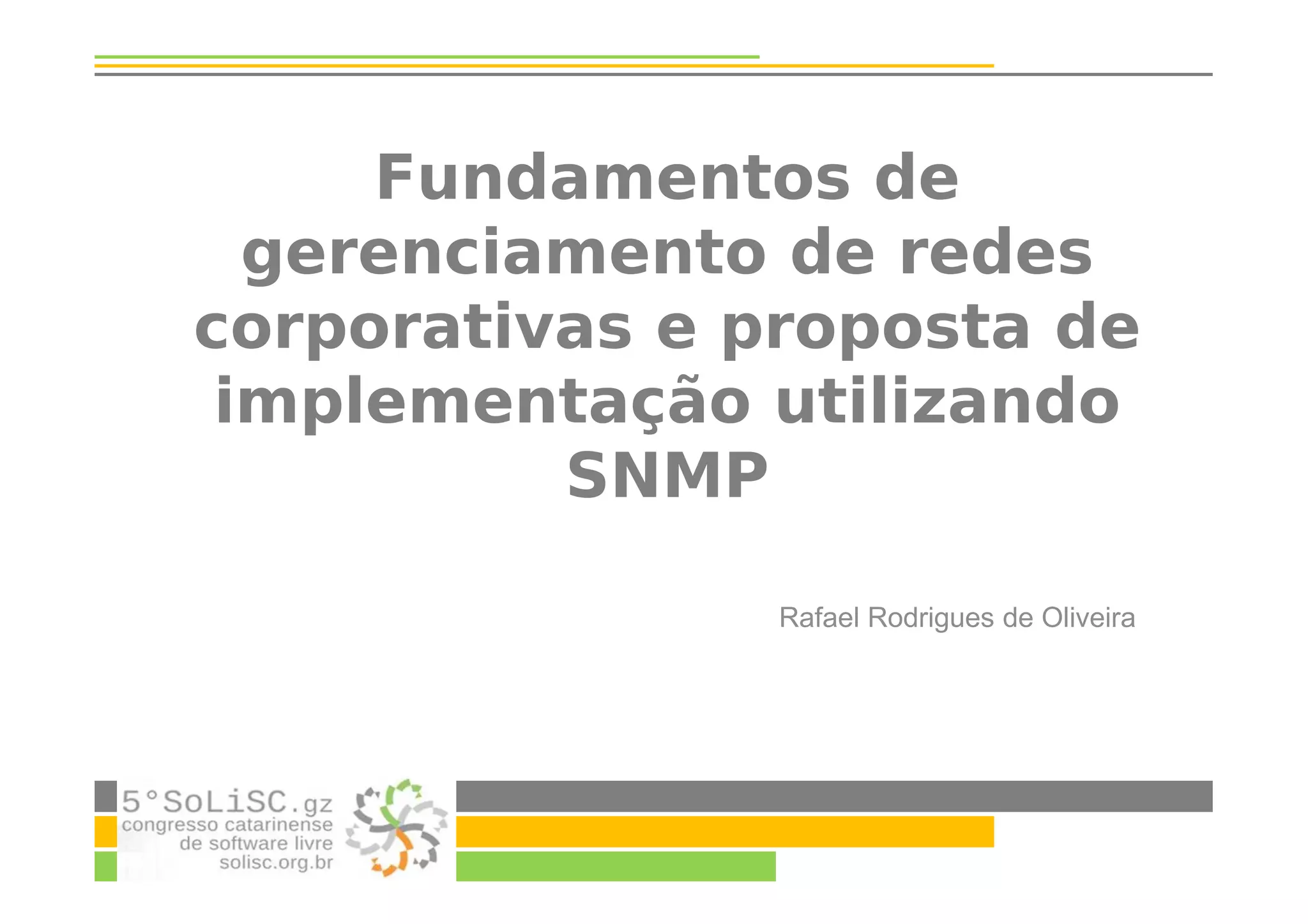 O documento discute os fundamentos do gerenciamento de redes corporativas e apresenta uma proposta de implementação utilizando o SNMP (Simple Network Management Protocol). Aborda os desafios atuais, as vantagens da automatização do monitoramento e detalha componentes e funcionamento do SNMP, incluindo um estudo de caso real da empresa Finamax S/A. Além disso, menciona ferramentas de monitoramento, sua configuração e exemplos de uso para obter informações e alertas sobre a infraestrutura de TI.