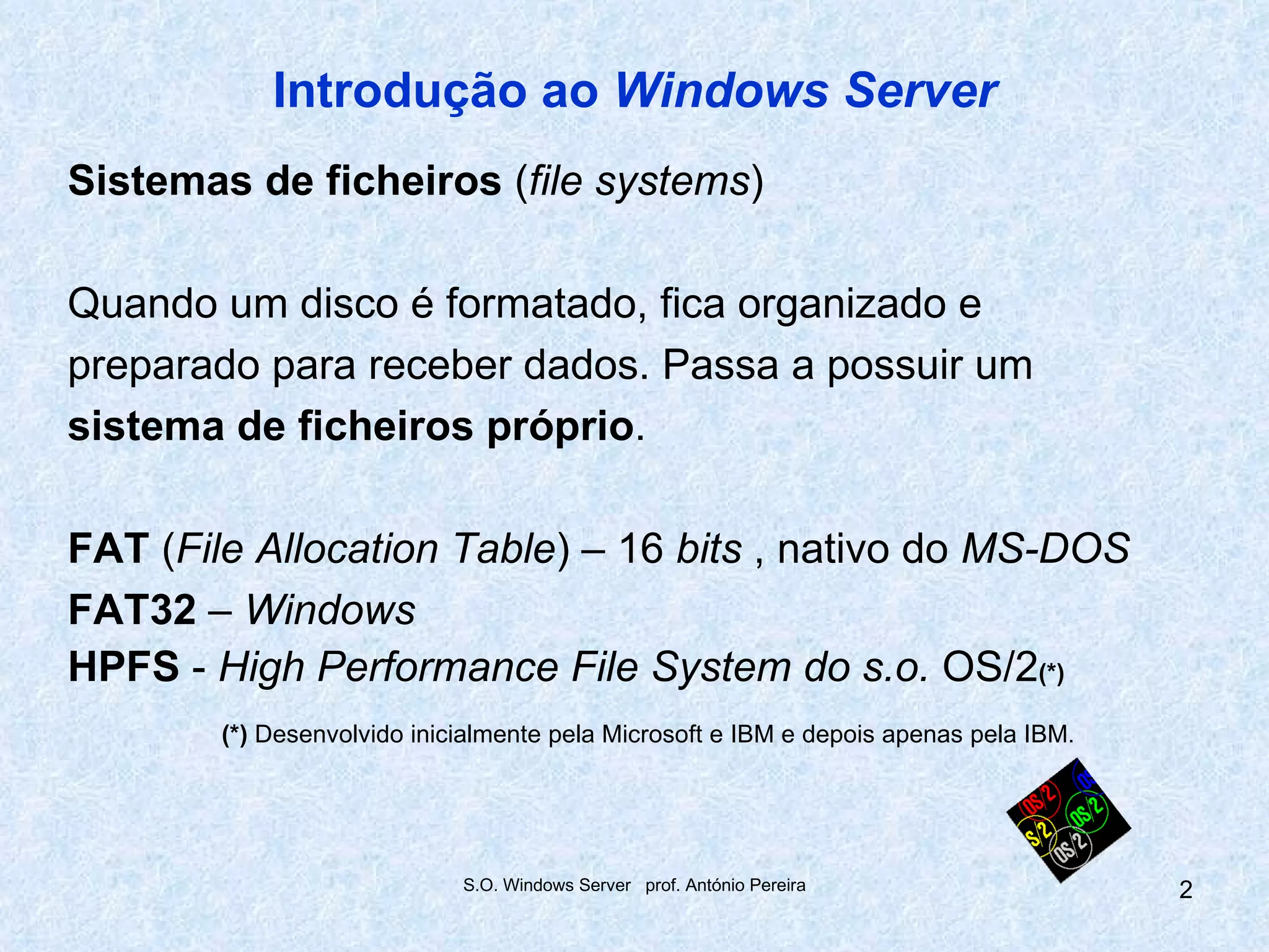 1) O documento descreve o sistema operativo Windows Server, incluindo seus sistemas de arquivos, objetivos, características e terminologia de redes. 2) É apresentado o histórico do Windows NT e das versões subsequentes do Windows Server. 3) Também são descritos conceitos-chave como Active Directory, Domain Controller e organização de domínios em árvores.