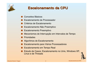 O documento discute os conceitos básicos de escalonamento de CPU, incluindo: 1) o papel do escalonador em determinar qual processo pronto será executado na CPU disponível; 2) os tipos de escalonamento preemptivo e não preemptivo; 3) o uso de interrupções por tempo para evitar monopolização da CPU.