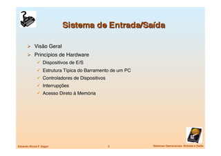 O documento discute os sistemas de entrada e saída em computadores, incluindo os principais tipos de dispositivos, como funcionam os controladores e interrupções, e como os sistemas operacionais gerenciam a comunicação entre hardware e software.