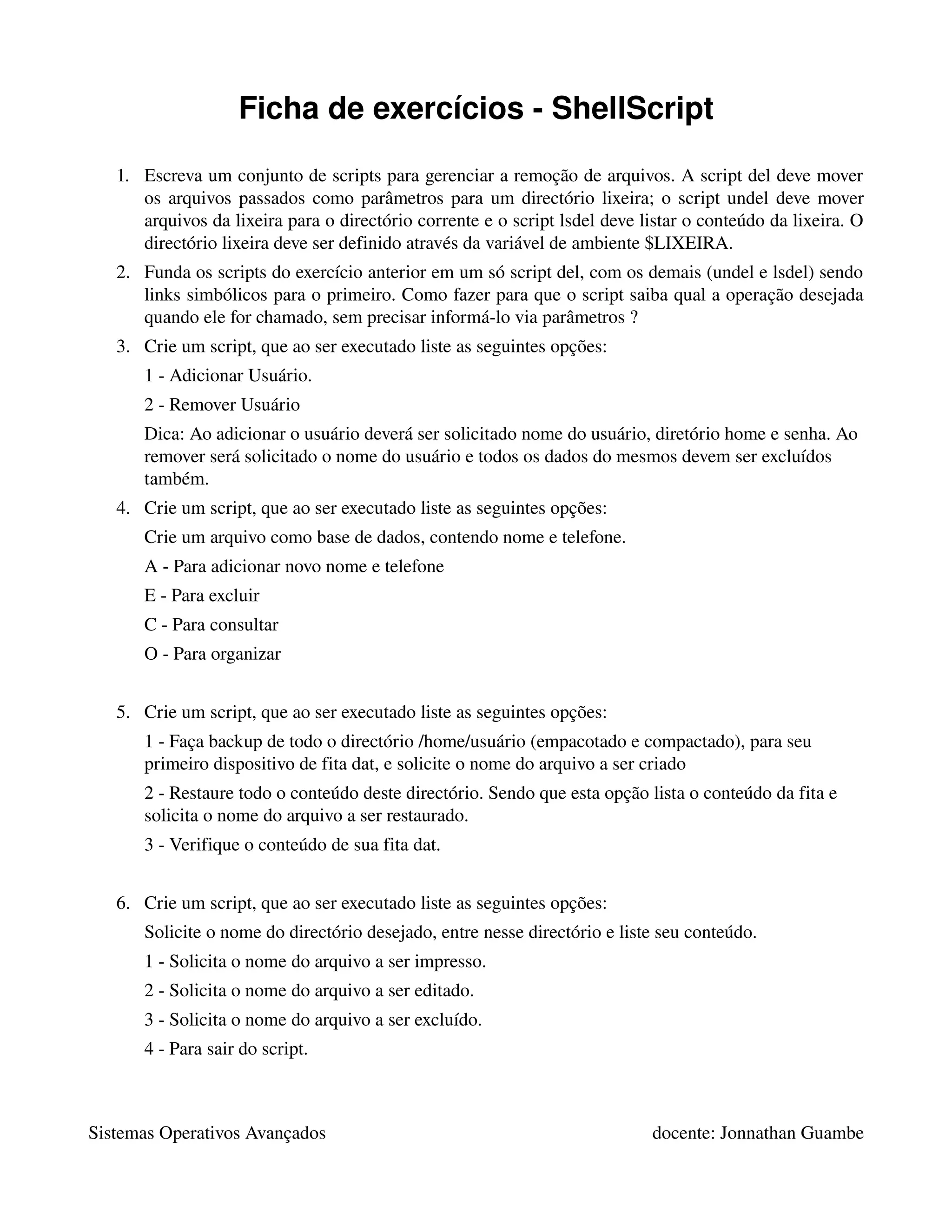 O documento descreve 6 exercícios de shell script para: 1) gerenciar arquivos removidos entre diretórios, 2) fundir scripts em um único script, 3) adicionar e remover usuários, 4) manter uma base de dados de nomes e telefones, 5) fazer backup e restaurar arquivos em fitas dat, e 6) listar, imprimir, editar e excluir arquivos dentro de diretórios.