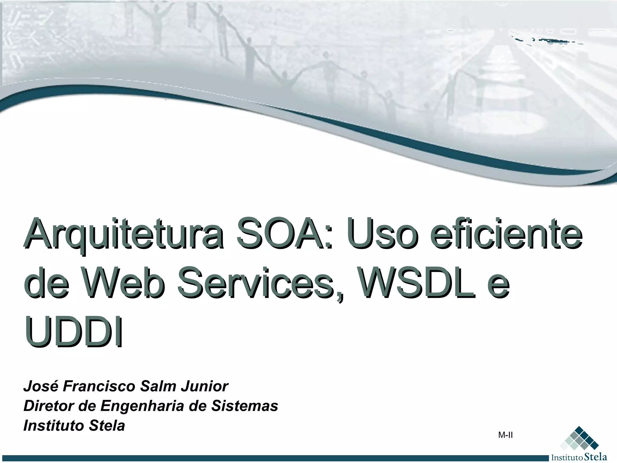 O documento discute arquitetura orientada a serviços (SOA) e padrões relacionados a web services. Ele explica os principais elementos de uma arquitetura SOA, incluindo repositórios de serviços, bus de serviços e aplicações front-end. Também descreve conceitos como web services, contratos de utilização e realização, e padrões como UDDI, WSDL e SOAP.