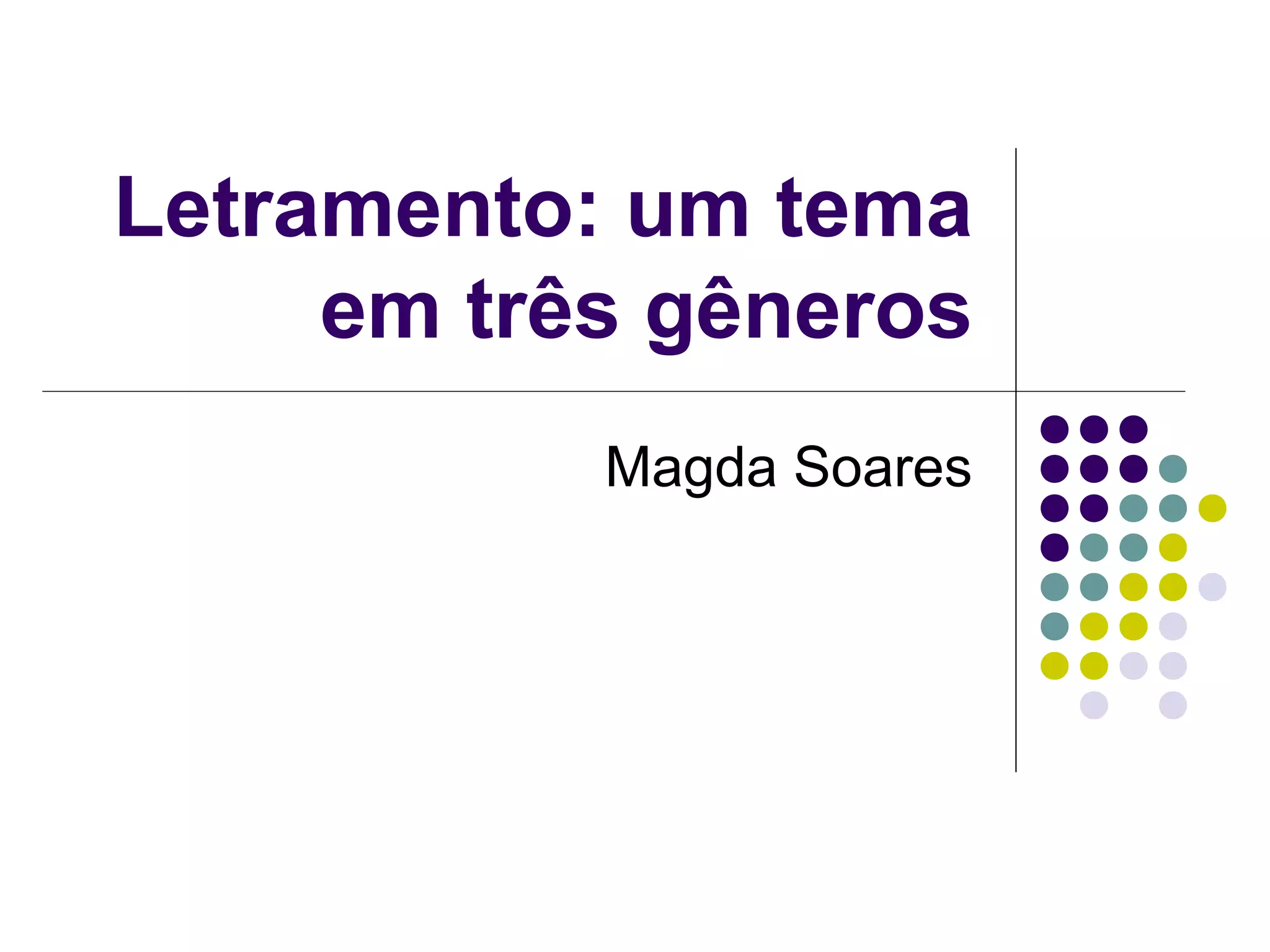 O documento discute o conceito de letramento em três gêneros: texto didático, ensaio e artigo. Apresenta diferentes definições de letramento, alfabetização e modelos de letramento. Também reflete sobre os desafios de definir e medir o letramento.