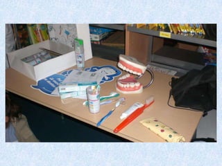 Uma enfermeira visitou uma escola para falar sobre saúde oral com os alunos do pré-escolar, ensinando a importância de escovar os dentes corretamente, distinguir alimentos bons e maus para os dentes, e jogos interativos sobre o tema.