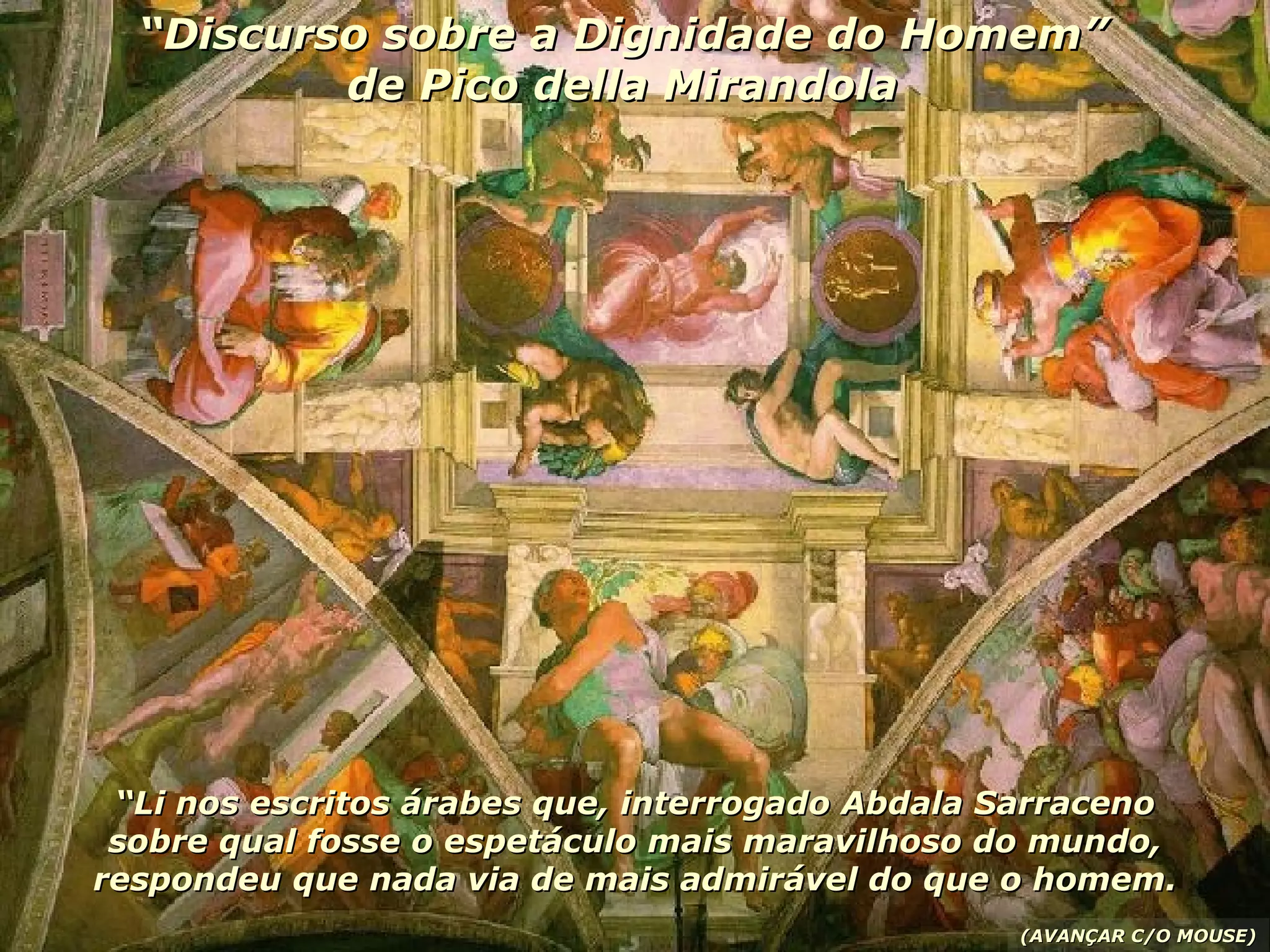 O documento resume o discurso de Pico della Mirandola sobre a dignidade do homem, afirmando que Deus deu ao homem a capacidade única de escolher livremente sua natureza, podendo se elevar aos anjos ou degenerar aos animais, de acordo com suas escolhas. O texto também fornece contexto biográfico sobre Mirandola, descrevendo sua vida dedicada aos estudos e como suas ideias controversas levaram a acusações de heresia.