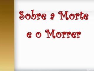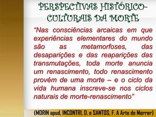 O documento aborda as perspectivas históricas e culturais sobre a morte, destacando como diferentes eras e correntes filosóficas a interpretaram, desde a visão da morte como um processo de renascimento até a medicalização da morte na era moderna. Apresenta uma análise das reações humanas diante da morte, como negação, raiva e aceitação, e discute a visão espírita que considera a morte como uma continuidade da vida em melhores condições. Enfatiza a dualidade entre o temor e a esperança que a morte suscita nas consciências humanas ao longo da história.
