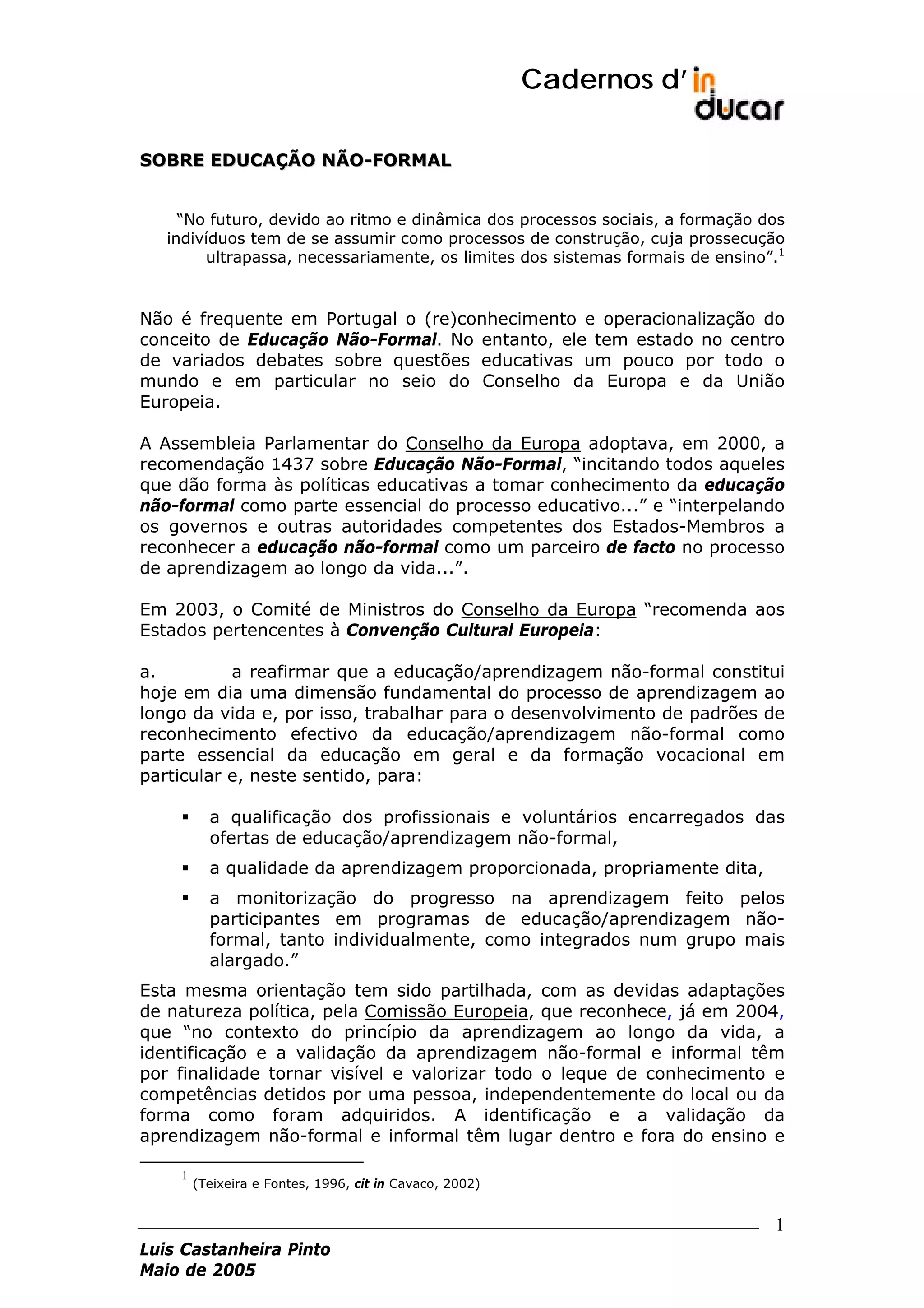 1) O documento discute a educação não-formal, que é definida como um processo de aprendizagem social fora do sistema de ensino formal e complementar a este.