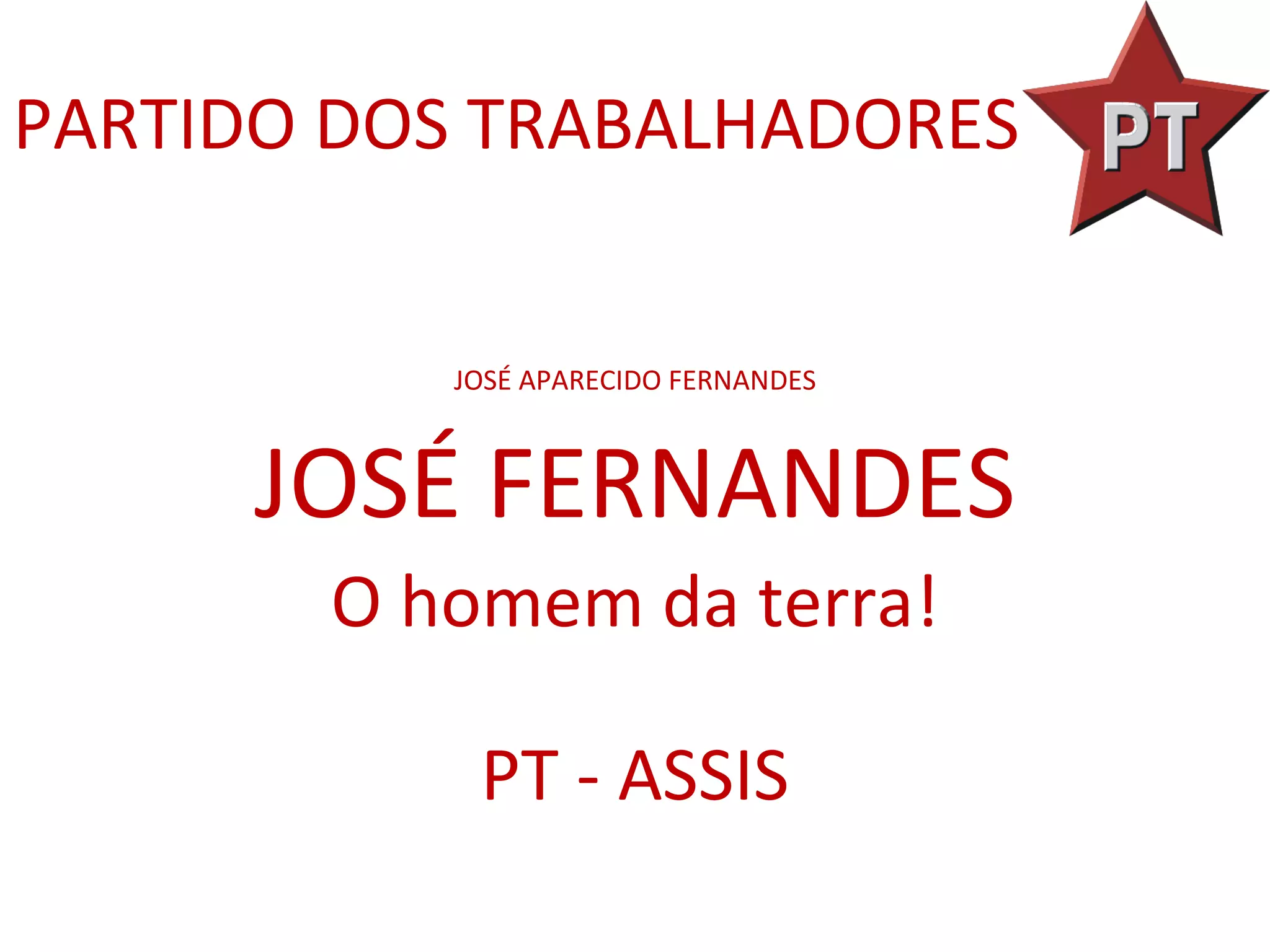 José Aparecido Fernandes, empresário e produtor rural, atua politicamente pelo Partido dos Trabalhadores desde 2002, com diversas eleições e propostas aprovadas nas áreas de agricultura e assistência social. Ele idealizou e fundou a Associação de Produtores Rurais de Assis e tem promovido eventos beneficentes significativos como a Festa do Milho. Atualmente, está envolvido em projetos como o Restaurante Popular e programas de desenvolvimento rural sustentável.