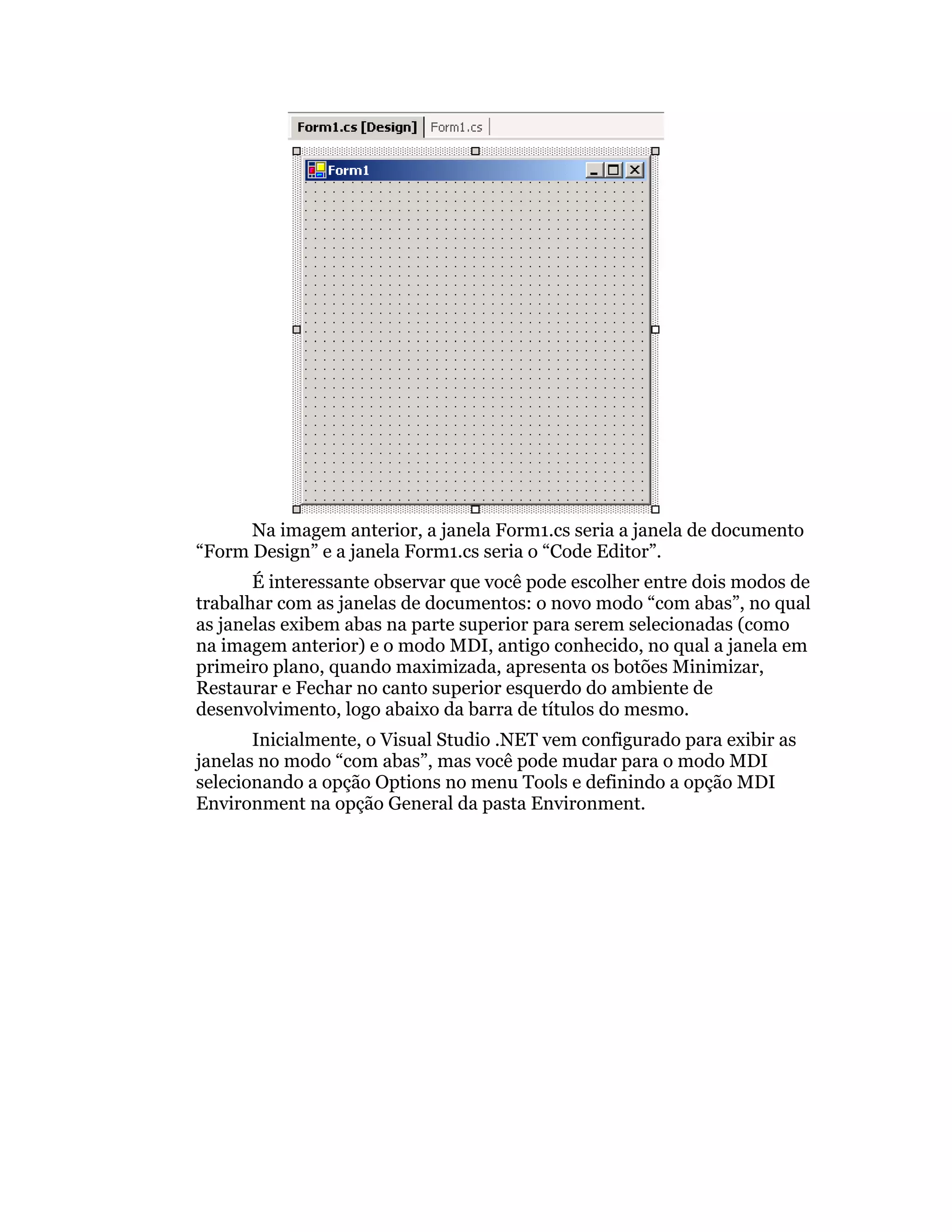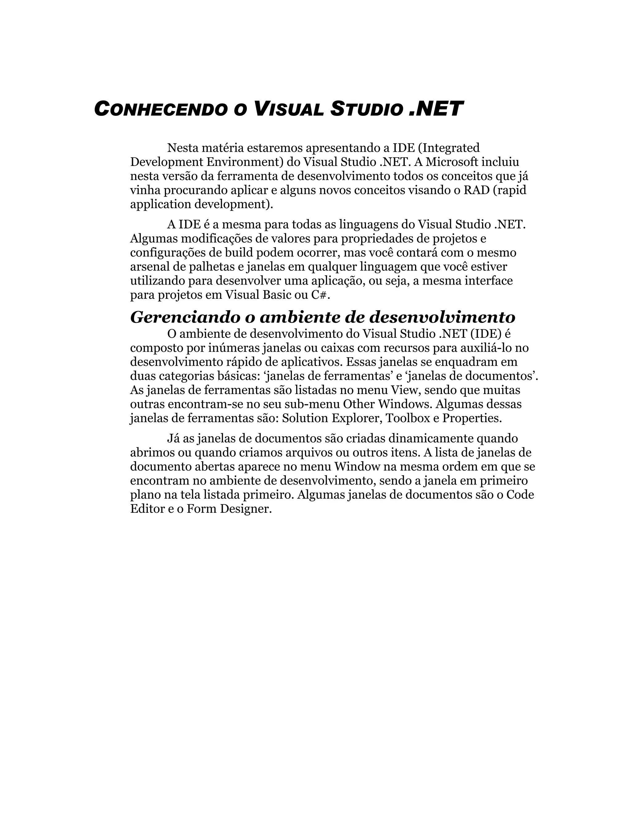 O documento apresenta o ambiente de desenvolvimento integrado (IDE) do Visual Studio .NET. Descreve as principais janelas do IDE, como o Solution Explorer para gerenciar projetos, a Toolbox com controles, a Properties para configurar propriedades e o Object Browser para navegar entre classes e membros.