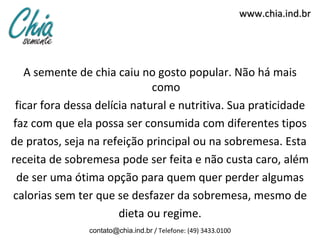O documento fornece uma receita de sobremesa saudável com sementes de chia, que inclui mamão, banana, actimel, linhaça e suco de laranja batidos no liquidificador e acrescentados de sementes de chia. A sobremesa é uma boa opção para dietas e regimes por ser nutritiva e de baixa caloria. O site também discute os benefícios das sementes de chia para a saúde.