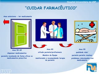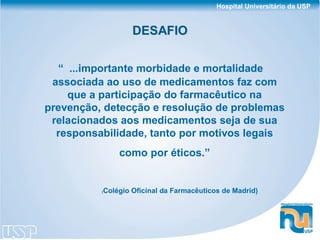O documento descreve as atividades de um serviço de farmácia clínica pediátrica em um hospital universitário, incluindo o número de farmacêuticos, processo de prescrição médica, entrevistas com pacientes, avaliação de prescrições, intervenções farmacêuticas, indicadores do serviço e tipos comuns de intervenções realizadas.