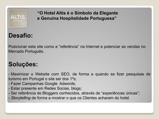 1) O documento discute estratégias de marketing digital e mídia social para melhorar o posicionamento online e aumentar as vendas de um hotel em Portugal.