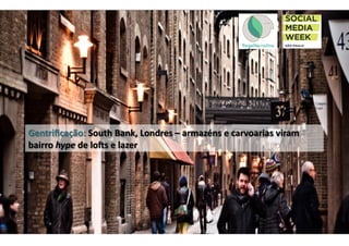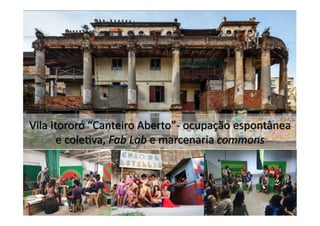 O documento discute iniciativas de regeneração urbana e comunitária em cidades brasileiras através da criação e manutenção de espaços públicos comuns ("commons"). Apresenta exemplos de projetos que empoderam cidadãos e promovem a inovação coletiva de forma sustentável.