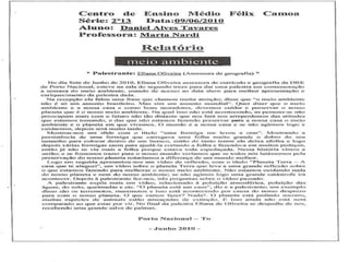 O documento apresenta um projeto de educação ambiental desenvolvido no Centro de Ensino Médio Félix Camoa em Porto Nacional, Tocantins. O projeto tem como objetivo ensinar os alunos a importância da preservação ambiental por meio de atividades práticas como horta, coleta seletiva e plantio de árvores.