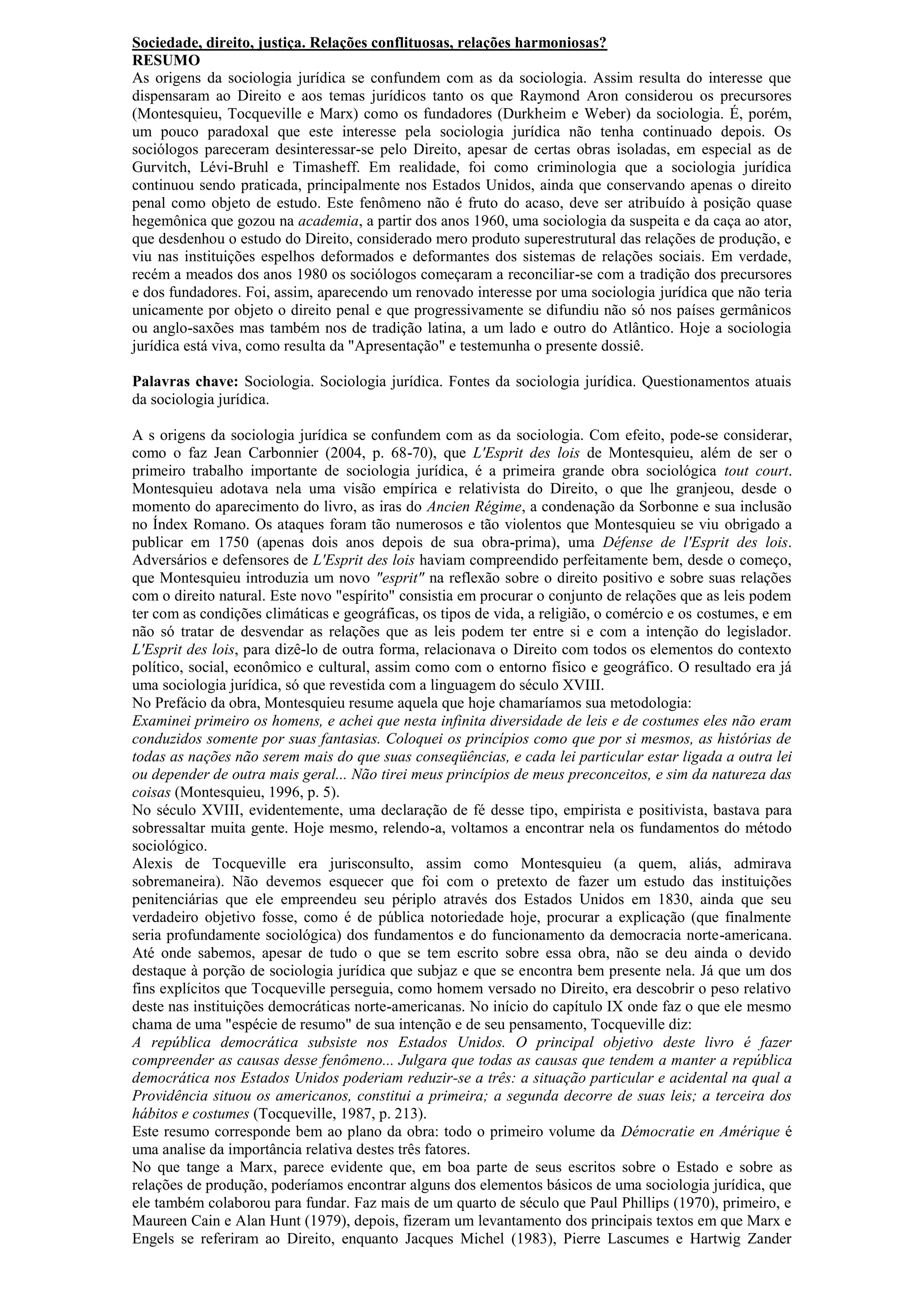 O documento discute as origens da sociologia jurídica e sua relação com a sociologia. Aponta que autores fundamentais como Montesquieu, Tocqueville, Marx, Durkheim e Weber contribuíram para o desenvolvimento inicial da sociologia jurídica, mas que o interesse na área diminuiu depois, permanecendo apenas como criminologia.