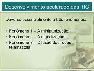 O documento discute as três principais forças por trás da digitalização da sociedade: 1) a miniaturização, que reduziu custos e difundiu as TIC; 2) a digitalização, que permitiu a quantificação e comercialização da informação; e 3) as redes telemáticas, que ampliaram a capacidade de transporte de informação. A informação tornou-se uma moeda importante e vivemos na era da informação, na qual as TIC desempenham um papel essencial, embora tenham avançado mais rápido do que a pró