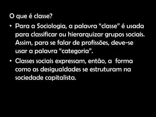 O documento discute as classes sociais na sociedade capitalista e as desigualdades estruturais presentes nela, como na distribuição de riqueza, poder político e acesso à educação. Apresenta perspectivas de Marx, Weber e Davis-Moore sobre classes sociais e como elas se relacionam com o poder e a desigualdade social. Fornece também dados sobre a fome no Brasil.