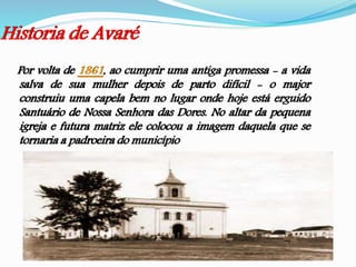 O documento descreve a história da cidade de Avaré no interior de São Paulo, incluindo a construção da primeira capela no século XIX e os principais pontos turísticos atuais da cidade, como o Cristo Redentor, Horto Florestal, Monumento ao Desbravador e Museu. O documento também lista os integrantes do grupo que produziu o trabalho.