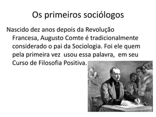 Auguste Comte é considerado o fundador da Sociologia. Ele propôs estudar a sociedade como um organismo vivo e dar importância às idéias compartilhadas que mantêm a ordem social. Émile Durkheim formulou a Sociologia como uma ciência objetiva, vendo os fatos sociais como coisas externas que exercem coerção sobre as pessoas. Max Weber defendeu uma abordagem interpretativa, focada no sentido dado pelas pessoas às suas próprias ações.
